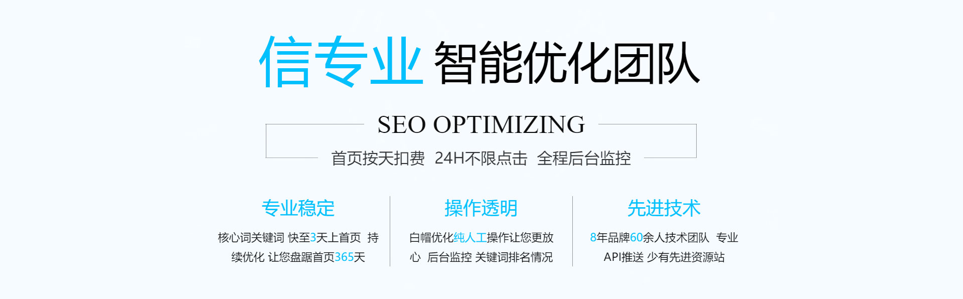 關(guān)鍵詞優(yōu)化,無效果退款!專業(yè)技術(shù)管控賬戶,減少無效點(diǎn)擊,全方位網(wǎng)絡(luò)推廣,讓您的信息遍布互聯(lián)網(wǎng)。